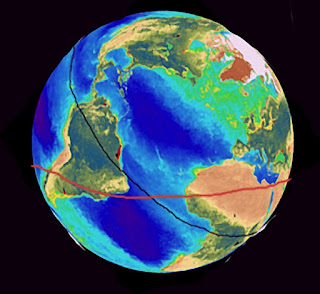 Il y a 75 000 ans et même avant cela, la ceinture d’énergie autour de la planète était complète, sous le contrôle total des Êtres Ascensionnés et avec de nombreux temples sacrés positionnés autour de l’équateur. Vous pouvez voir l’ancien équateur Atlante sur cette photo, représenté par une ligne rouge traversant l’Amérique du Sud et l’Afrique :
